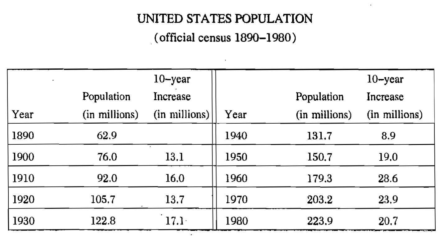 By how many million did the Unitied States population increase from 1920 to 1950?